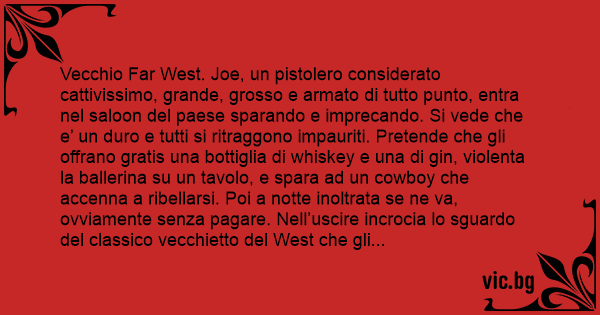 Vecchio Far West. Joe, un pistolero considerato cattivissimo, grande, grosso e armato di tutto punto, entra nel saloon del paese sparando e imprecando. Si vede che e’ un durо e tutti si ritraggono impauriti. Pretende che gli offrano gratis una bottiglia di whiskey e una di gin, violenta la ballerina su un tavolo, e spara ad un cowboy che accenna a ribellarsi. Poi a notte inoltrata se ne va, ovviamente senza pagare. Nell’uscire incrocia lo sguardo del classico vecchietto del West che gli sussurra: