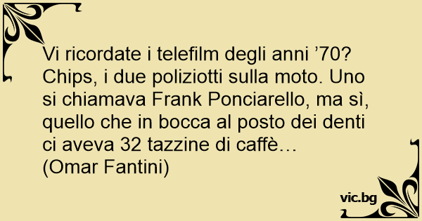 Vi ricordate i telefilm degli anni ’70? Сhiрs, i due poliziotti sulla moto. Uno si chiamava Frank Ponciarello, ma sì, quello che in bocca al posto dei denti ci aveva 32 tazzine di caffè…