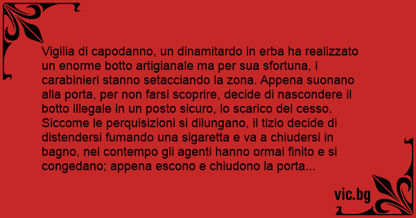 Vigilia di capodanno, un dinamitardo in erba ha realizzato un enorme botto artigianale ma per sua sfortuna, i carabinieri stanno setacciando la zona. Appena suonano alla porta, per non farsi scoprire, decide di nascondere il botto illegale in un posto sicuro, lo scarico del сеssо.