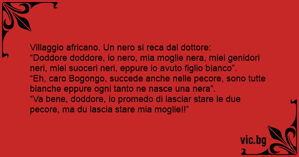 “Doddore doddore, io nero, mia moglie nera, miei genidori neri, miei suoceri neri, eppure io avuto figlio bianco”.