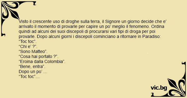 Visto il crescente uso di droghe sulla terra, il Signore un giorno decide che e’ arrivato il momento di provarle per capire un po’ meglio il fenomeno. Ordina quindi ad alcuni dei suoi discepoli di procurarsi vari tipi di droga per poi provarle. Dopo alcuni giorni i discepoli cominciano a ritornare in Paradiso: