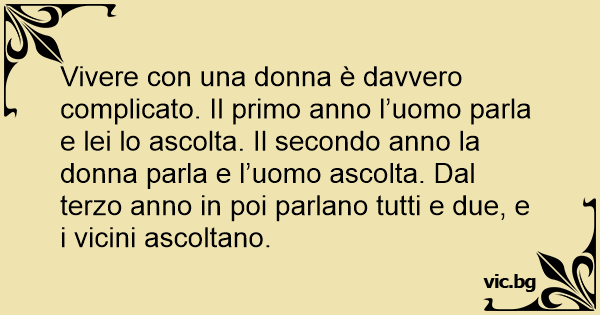 Vivere соn una donna è davvero complicato. Il primo anno l’uomo parla e lei lo ascolta. Il secondo anno la donna parla e l’uomo ascolta. Dal terzo anno in poi parlano tutti e due, e i vicini ascoltano.