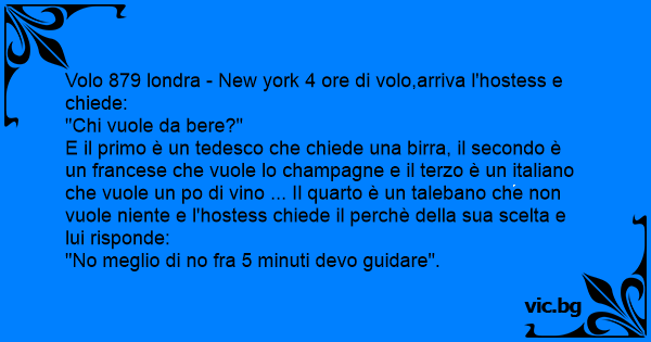 E il primo è un tedesco che chiede una birra, il secondo è un francese che vuole lo champagne e il terzo è un italiano che vuole un po di vino ... Il quarto è un talebano che non vuole niente e l'hostess chiede il perchè della sua scelta e lui risponde: