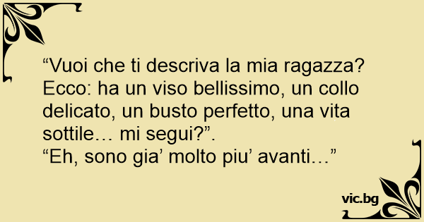 “Vuoi che ti descriva la mia ragazza? Ecco: ha un viso bellissimo, un collo delicato, un busto perfetto, una vita sottile… mi segui?”.