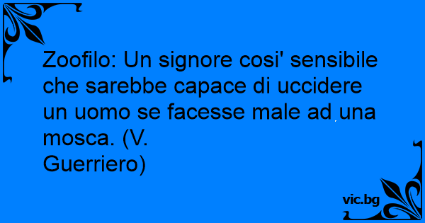 Zoofilo: Un signore cosi' sensibile che sarebbe capace di uccidere un uomo se facesse male ad una mosca. (V.