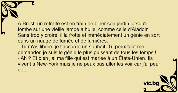 - Ah ? Et bien j'ai ma fille qui est mariée à un États-Unien. Ils vivent à New-York mais je ne peux pas aller les voir car j'ai peur de l'avion, et en bateau, ça prend des jours et j'ai le mal de mer, je ne tiendrai jamais... Génie, je voudrais une autoroute sur un pont qui relie Brest à New-York !