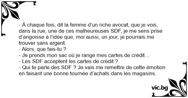 - À chaque fois, dit la femme d’un riche avocat, que je vois, dans la rue, une de ces malheureuses SDF, je me sens prise d’angoisse à l’idée que, moi aussi, un jour, je pourrais me trouver sans argent.