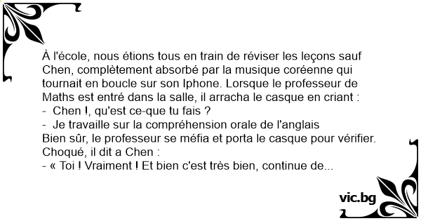 À l'école, nous étions tous en train de réviser les leçons sauf Chen, complètement absorbé par la musique coréenne qui tournait en boucle sur son Iphone. Lorsque le professeur de Maths est entré dans la salle, il arracha le casque en criant :