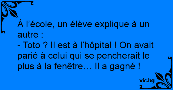 - Toto ? Il est à l’hôpital ! On avait parié à celui qui se pencherait le plus à la fenêtre… Il a gagné !