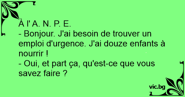 - Bonjour. J'ai besoin de trouver un emploi d'urgence. J'ai douze enfants à nourrir !