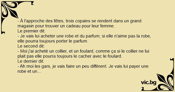 - Ah moi les gars, je vais faire un peu différent. Je vais lui payer une robe et un préservatif. Si elle n'aime pas la robe, elle pourra toujours se faire enculer !