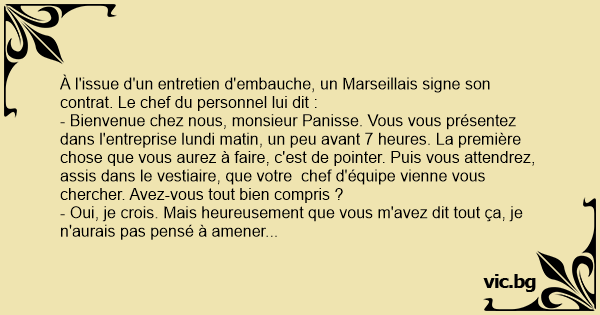 À l'issue d'un entretien d'embauche, un Marseillais signe son contrat. Le chef du personnel lui dit :