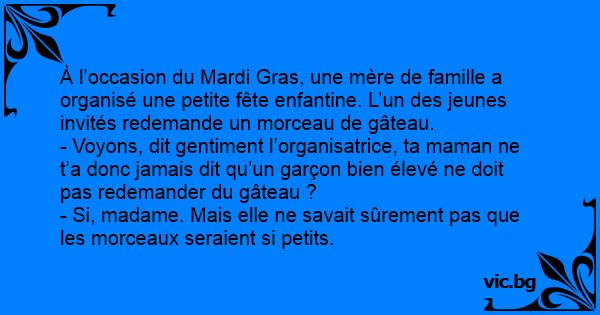 - Voyons, dit gentiment l’organisatrice, ta maman ne t’a donc jamais dit qu’un garçon bien élevé ne doit pas redemander du gâteau ?