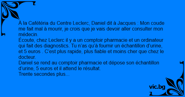 Écoute, chez Leclerc il y a un comptoir pharmacie et un ordinateur qui fait des diagnostics. Tu n’as qu’à fournir un échantillon d’urinе, et 5 euros . C’est plus rapide, plus fiable et moins cher que chez le docteur.