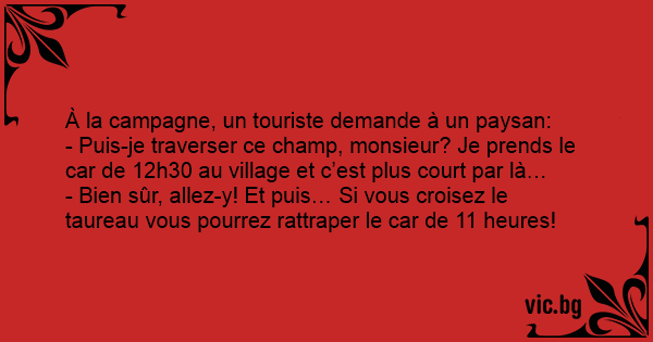 - Puis-je traverser ce champ, monsieur? Je prends le car de 12h30 au village et c’est plus court par là…