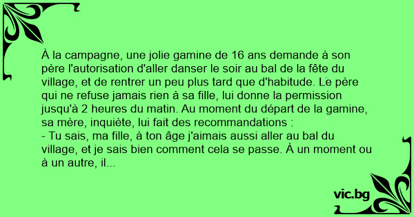 - Tu sais, ma fille, à ton âge j'aimais aussi aller au bal du village, et je sais bien comment cela se passe. À un moment ou à un autre, il y a un garçon qui te demandera de lui faire un bisou sur la joue, puis de l'embrasser sur la bouche. Après, il te proposera d'aller vous reposer dans sa chambre ou peut-être sur la paille dans une grange. Promets-moi de dire non à toutes ces demandes, sinon tu feras beaucoup pleurer ta pauvre mère !