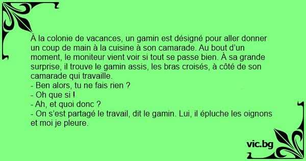 À la colonie de vacances, un gamin est désigné pour aller donner un coup de main à la cuisine à son camarade. Au bout d’un moment, le moniteur vient voir si tout se passe bien. À sa grande surprise, il trouve le gamin assis, les bras croisés, à côté de son camarade qui travaille.