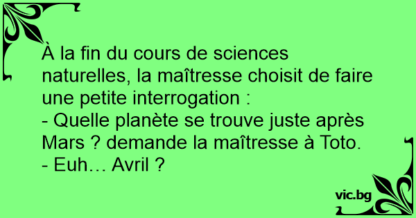 - Quelle planète se trouve juste après Mars ? demande la maîtresse à Toto.