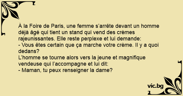 À la Foire de Paris, une femme s’arrête devant un homme déjà âgé qui tient un stand qui vend des crèmes rajeunissantes. Elle reste perplexe et lui demande: