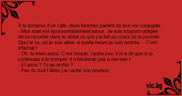 - Oh, le mien aussi. C’est simple, l’autre jour, il m’a dit que si je continuais à le tromper, il n’hésiterait pas à me tuer !