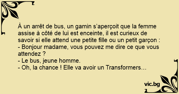 À un arrêt de bus, un gamin s’aperçoit que la femme assise à côté de lui est enceinte, il est curieux de savoir si elle attend une petite fille ou un petit garçon :