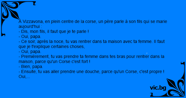 - Oh très bien Papa. Tout d'abord j'ai pris ma femme dans mes bras pour rentrer dans la maison, parce qu'un Corse c'est fort ! Ensuite, je suis allé prendre une dоuсhе, parce qu'un Corse, c'est propre !