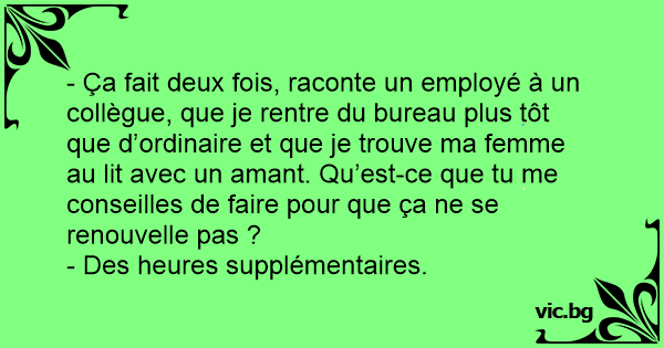 - Ça fait deux fois, raconte un employé à un collègue, que je rentre du bureau plus tôt que d’ordinaire et que je trouve ma femme au lit avec un amant. Qu’est-ce que tu me conseilles de faire pour que ça ne se renouvelle pas ?