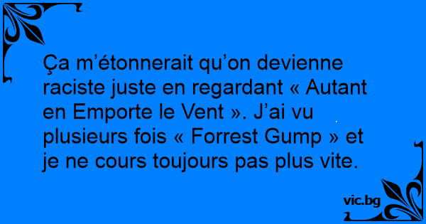 Ça m’étonnerait qu’on devienne raciste juste en regardant « Autant en Emporte le Vent ». J’ai vu plusieurs fois « Forrest Gump » et je ne cours toujours pas plus vite.