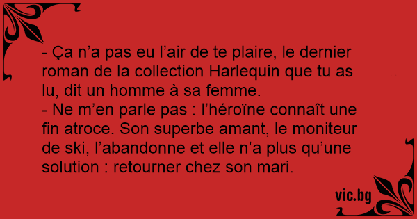 - Ça n’a pas eu l’air de te plaire, le dernier roman de la collection Harlequin que tu as lu, dit un homme à sa femme.