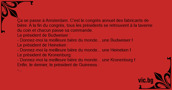 Ça se passe à Amsterdam. C'est le congrès annuel des fabricants de bière. A la fin du congrès, tous les présidents se retrouvent à la taverne du coin et chacun passe sa commande.