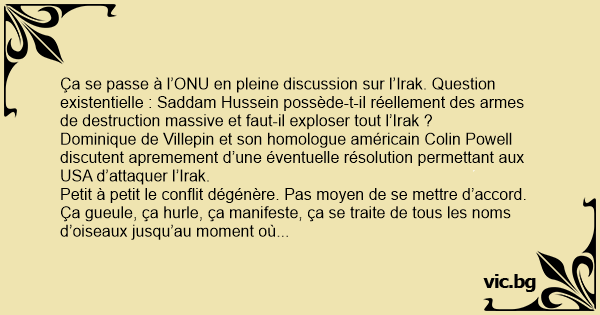 Ça se passe à l’ONU en pleine discussion sur l’Irak. Question existentielle : Saddam Hussein possède-t-il réellement des armes de destruction massive et faut-il exploser tout l’Irak ?