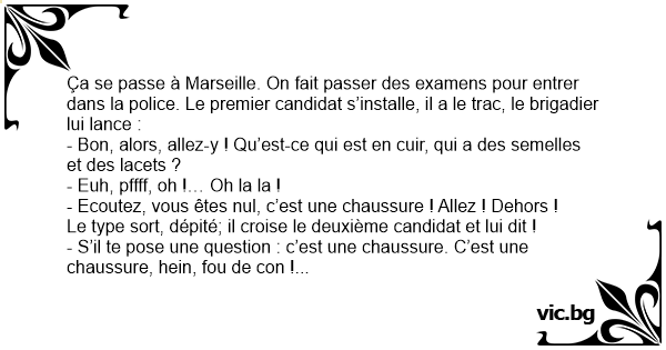 Ça se passe à Marseille. On fait passer des examens pour entrer dans la police. Le premier candidat s’installe, il a le trac, le brigadier lui lance :