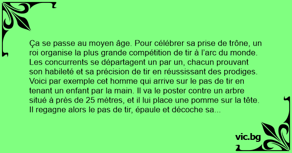 Un grand « Ohhh » de stupeur secoue la foule qui ne comprend pas. Le tireur s’avance alors vers le roi et dit :