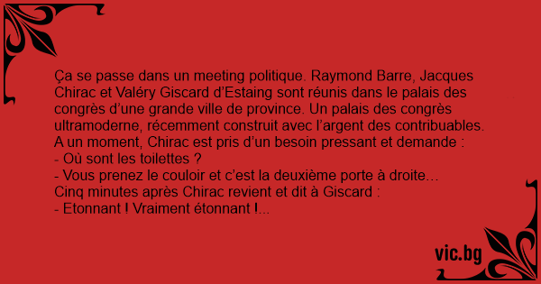 Ça se passe dans un meeting politique. Raymond Barre, Jacques Chirac et Valéry Giscard d’Estaing sont réunis dans le palais des congrès d’une grande ville de province. Un palais des congrès ultramoderne, récemment construit avec l’argent des contribuables. A un moment, Chirac est pris d’un besoin pressant et demande :