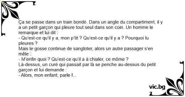 Ça se passe dans un train bondé. Dans un angle du compartiment, il y a un petit garçon qui pleure tout seul dans son coin. Un homme le remarque et lui dit :