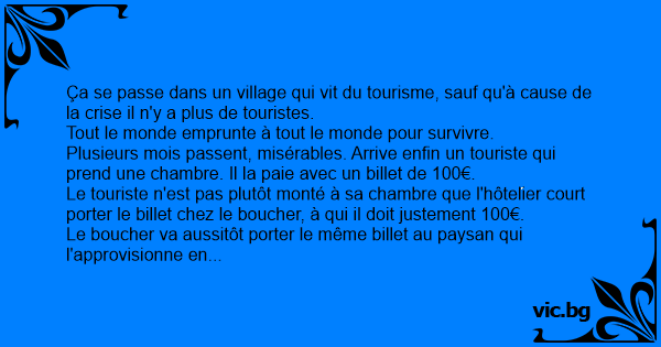 Le touriste n'est pas plutôt monté à sa chambre que l'hôtelier court porter le billet chez le boucher, à qui il doit justement 100€.