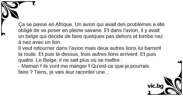 Ça se passe en Afrique. Un avion qui avait des problèmes a été obligé de se poser en pleine savane. Et dans l’avion, il y avait un belge qui décide de faire quelques pas dehors et tombe nez à nez avec un lion.