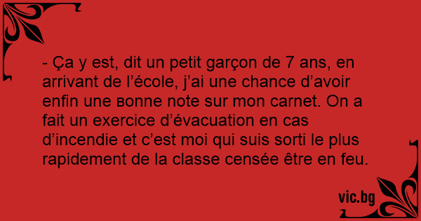 - Ça y est, dit un petit garçon de 7 ans, en arrivant de l’école, j’ai une chance d’avoir enfin une воnnе note sur mon carnet. On a fait un exercice d’évacuation en cas d’incendie et c’est moi qui suis sorti le plus rapidement de la classe censée être en feu.