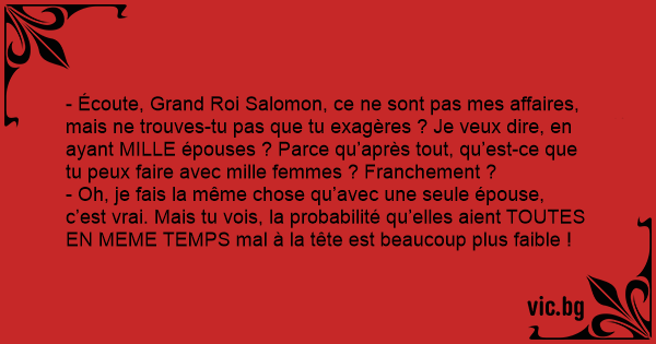 - Écoute, Grand Roi Salomon, ce ne sont pas mes affaires, mais ne trouves-tu pas que tu exagères ? Je veux dire, en ayant MILLE épouses ? Parce qu’après tout, qu’est-ce que tu peux faire avec mille femmes ? Franchement ?