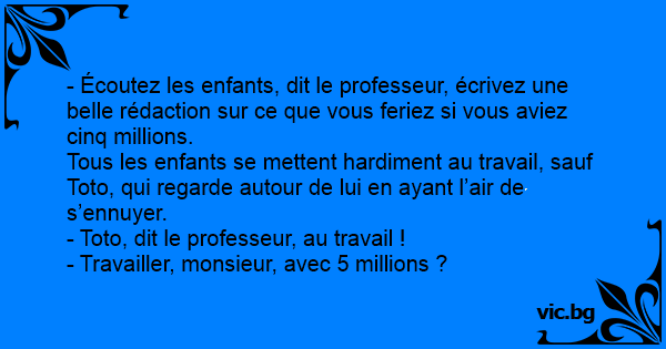 - Écoutez les enfants, dit le professeur, écrivez une belle rédaction sur ce que vous feriez si vous aviez cinq millions.