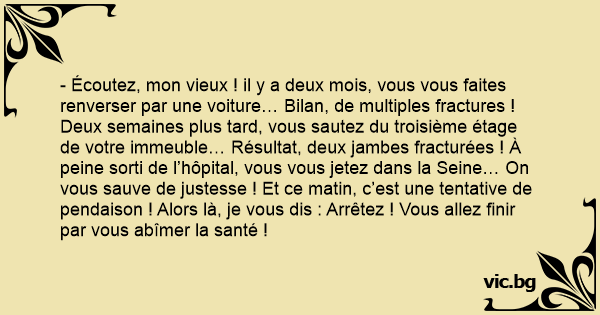 - Écoutez, mon vieux ! il y a deux mois, vous vous faites renverser par une voiture… Bilan, de multiples fractures ! Deux semaines plus таrd, vous sautez du troisième étage de votre immeuble… Résultat, deux jambes fracturées ! À peine sorti de l’hôpital, vous vous jetez dans la Seine… On vous sauve de justesse ! Et ce matin, c’est une tentative de pendaison ! Alors là, je vous dis : Arrêtez ! Vous allez finir par vous abîmer la santé !