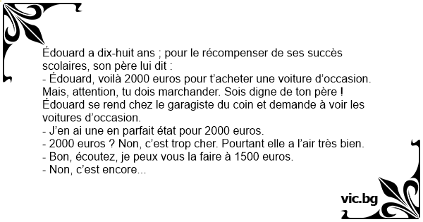 - Édouard, voilà 2000 euros pour t’acheter une voiture d’occasion. Mais, attention, tu dois marchander. Sois digne de ton père !