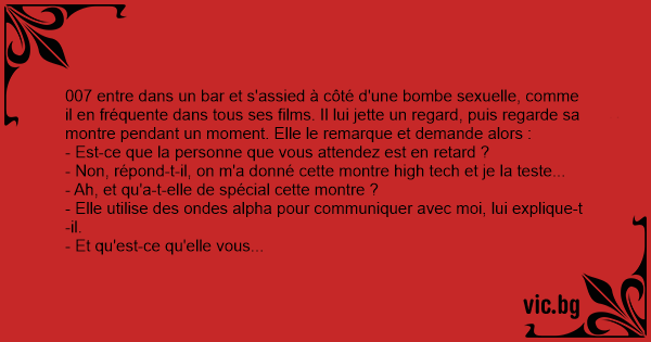 007 entre dans un bar et s'assied à côté d'une bombe sexuelle, comme il en fréquente dans tous ses films. Il lui jette un regard, puis regarde sa montre pendant un moment. Elle le remarque et demande alors :
