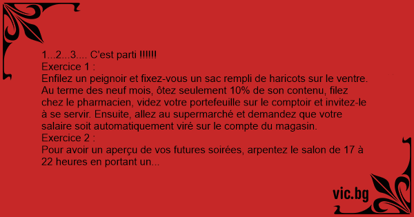 Pour avoir un aperçu de vos futures soirées, arpentez le salon de 17 à 22 heures en portant un sac humide pesant entre 4 et 6 kilos. A 22 heures posez le sac, réglez votre réveil à minuit et allez-vous coucher. A minuit, relevez-vous et marchez à nouveau dans le salon avec le sac pendant une heure. Réglez le réveil à 3 heures... Impossible de fermer l'œil, bien sûr, alors relevez-vous à 2 heures et servez-vous un verre. Retournez au lit à 2 heures 45. Quand le réveil sonne, un quart d'heure plus таrd, debout ! Chantez des berceuses dans le noir jusqu'à 4 heures. Réglez le réveil à 5 heures. Levez-vous, préparez le petit déjeuner. Maintenez ce rythme pendant 5 ans... dans la joie et la воnnе humeur !