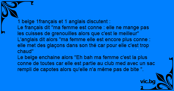 Le belge enchaine alors "Eh bah ma femme c'est la plus conne de toutes car elle est partie au club med avec un sac rempli de capotes alors qu'elle n'a même pas de bite ".