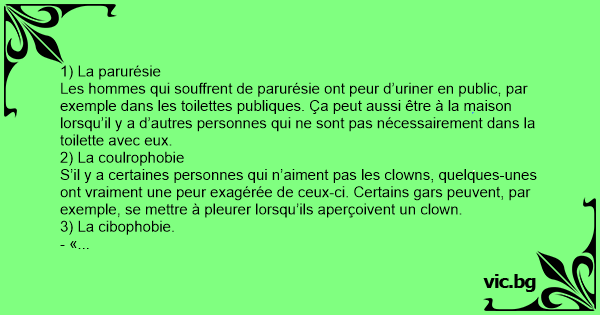 - « Mange tes brocolis! » Ne dites jamais ça à un gars qui souffre de cibophobie ! Il s’agit d’une peur des aliments verts, comme les légumes. Pour la plupart de ces gens souffrant de cette phobie, elle s’est développée durant leur jeune âge et ils ont associé le vert à l’anxiété.