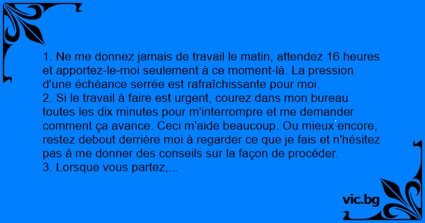 9. Si un travail nécessite des instructions particulières, ne me les écrivez pas. En fait, attendez jusqu'à la toute dernière minute pour me les donner. Il ne faudrait surtout pas m'emmêler ou me retarder avec des informations utiles.