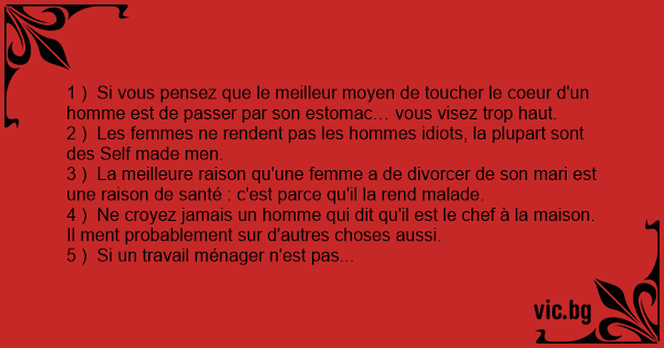 3 ) La meilleure raison qu'une femme a de divorcer de son mari est une raison de santé : c'est parce qu'il la rend malade.