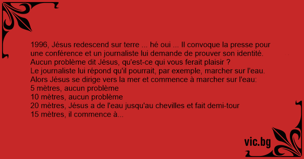 1996, Jésus redescend sur terre ... hé oui ... Il convoque la presse pour une conférence et un journaliste lui demande de prouver son identité. Aucun problème dit Jésus, qu'est-ce qui vous ferait plaisir ?