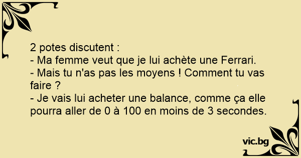 - Je vais lui acheter une balance, comme ça elle pourra aller de 0 à 100 en moins de 3 secondes.